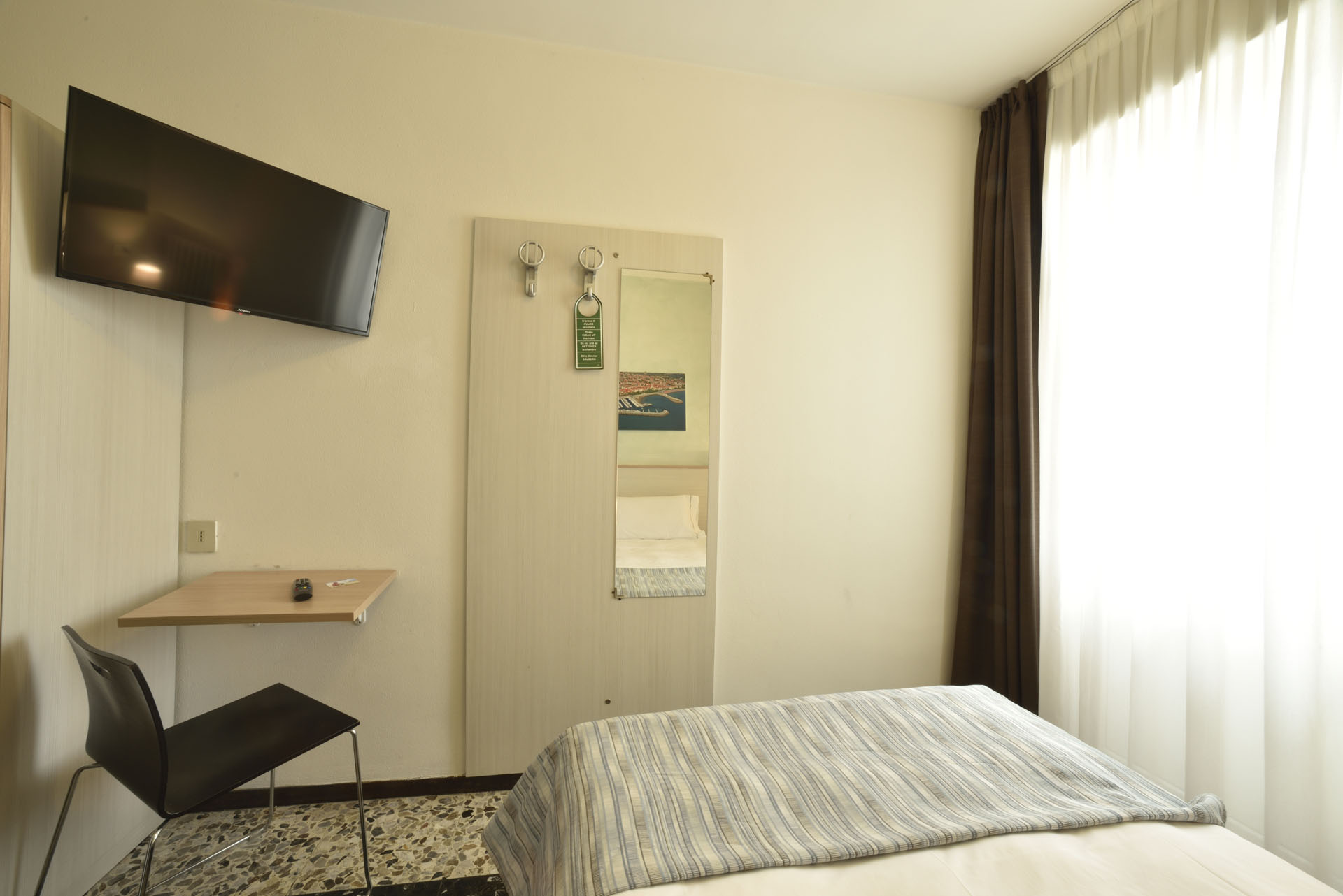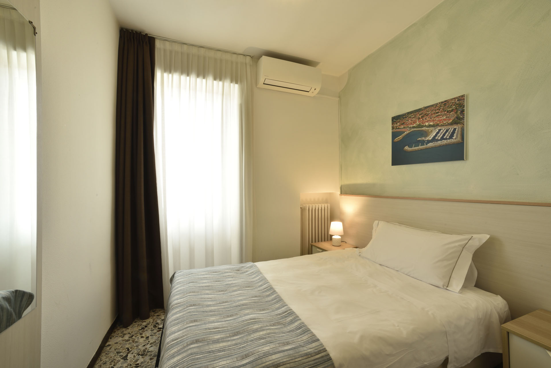 The economy single room is ideal for those who love traveling alone without sacrificing any comfort! It features a small double bed, a balcony with side sea view given our proximity to the sea (approx. 70m), private bathroom, flat-screen TV, and air conditioning.